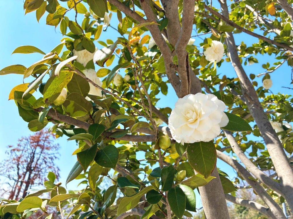 ユキヤナギも満開となり、遅咲きの?!サザンカも綺麗に咲いています。